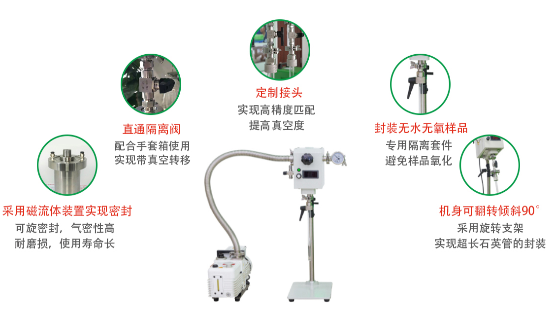內置粉體防回流裝置,防止石英管內的粉末材料被真空泵抽走,保護真空泵;可提供各種規格的石英管接頭,通過變換不同大小的接頭與石英管搭配來使用封口機;