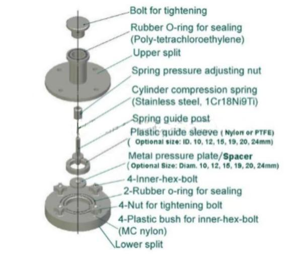 內部結構 | 裝置采用氟膠密封圈進行密封 兩級之間的絕緣環,是用抗腐蝕性較強的PTFE材料制作 內部包括不銹鋼壓緊桿和壓緊彈簧,一對電池極片和隔膜壓在儀器內。壓緊彈簧的壓力可以通過上部的螺紋壓緊桿進行調節 裝置標準配置Φ19、重20和重24mm三種規格PTFE導套和不銹鋼壓板。(其它尺寸可根據客戶要求進行定制) 內部空間最大可放料厚度為5mm(正基片+隔膜+負極片) 此裝置可以放入手套箱內使用 |